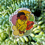 An approx. 3 in x 2.6 in high quality & waterproof vinyl sticker excited to be stuck on all of your favorite things.