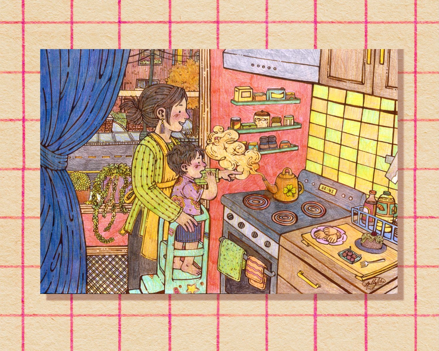 An illustration depicting a parent and child watching smoke rise from their kettle as they prepare for a tea party.