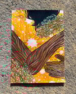 An original gouache, shimmery watercolor, and colored pencil piece approx. 5 in x 7 in on Bristol paper and sprayed with matte fixative.